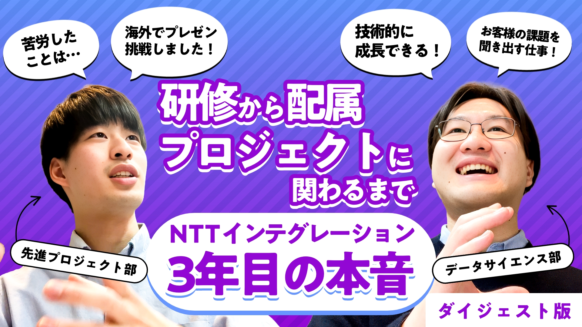 テクノロジー 若手 新卒 3年目若手社員の本音 入社から3年。研修を終え、プロジェクトの最前線に立ち始めたエンジニア2名による本音トークです。 「リクライブ」様ご協力のもと、台本なしの一発撮りでインタビューを実施。現場での試行錯誤や、小さな成功の積み重ね……。同期の2人だからこそ飛び出した、等身大の言葉が詰まった動画です。