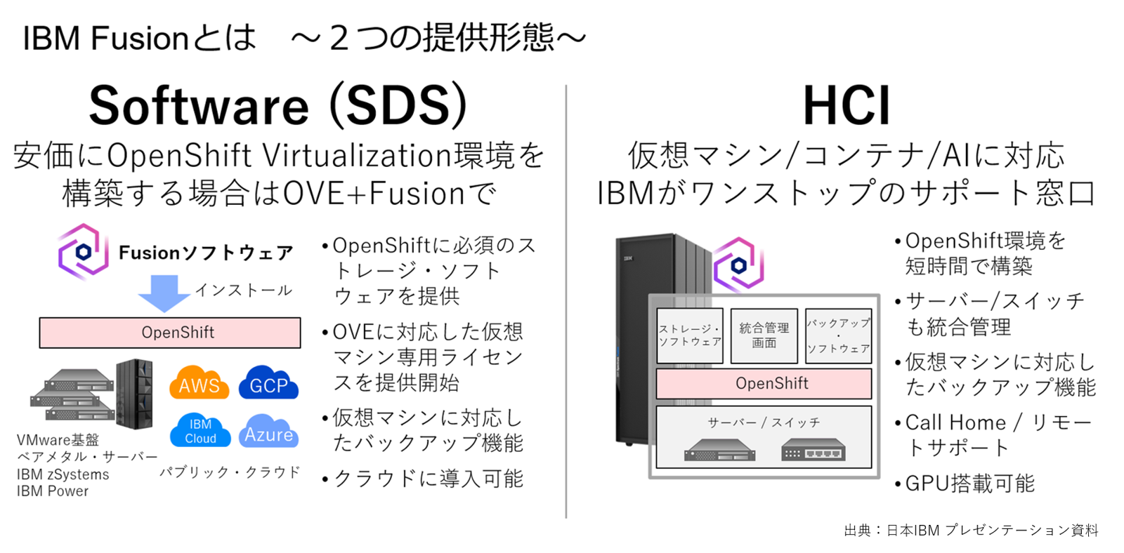 IBM Fusionは、OpenShiftとの高度な統合により、可用性・セキュリティ・データ保護など運用の主要課題を解決します。HCI基盤上でVMとコンテナを統一し、災害復旧やマルチクラスター管理など多様なユースケースに対応。(ソフトウェアとして提供も可能。)導入から自動化されたライフサイクル管理までを包括し、OpenShift環境の最適化と企業のモダナイゼーションを強力に推進します。