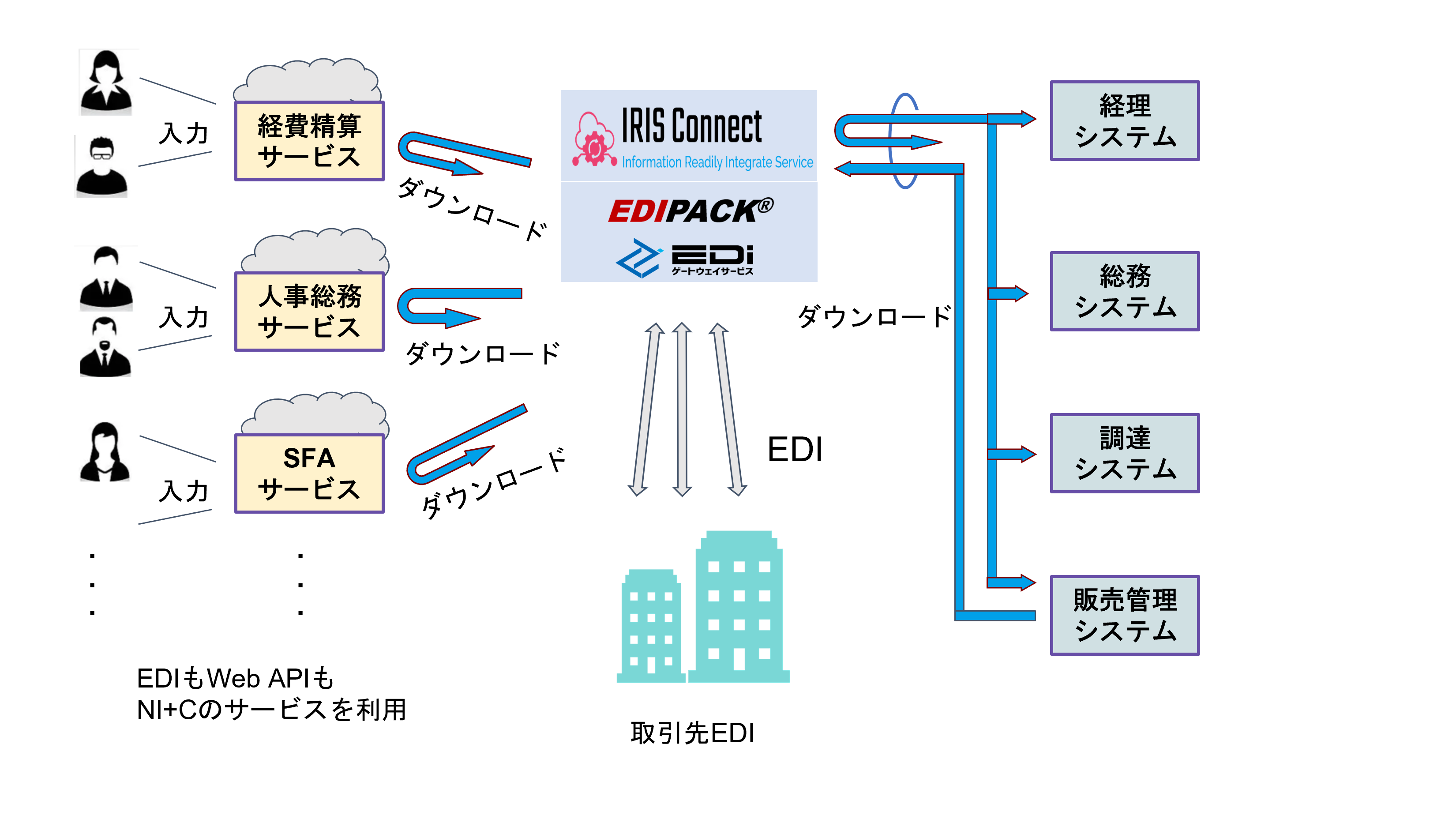 図2:NI+CのEDI(EDIPACK/EGW)とWeb APIサービス(IRIS Connect)を利用したパターン。