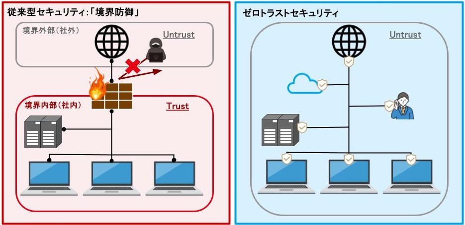 つまり、「社内=安全」「社外=危険」という従来の前提を捨て去り、「すべてを信頼しない(=Zero Trust)」を念頭に置いたセキュリティモデルということです。