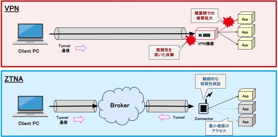また、多くのVPNは「一度認証したら、その接続中は基本的に信頼し続ける」という考え方です。最初にIDとパスワードなどによってログインすると、そのPCは社内LANに入った扱いになり、社内ネットワーク上の多くのサーバに到達できるようになります。このため、正規アカウントの不正利用などによって、そこから社内ネットワーク内へ横展開され、他のサーバやシステムまで被害が広がりやすい、というリスクがあったりもします。