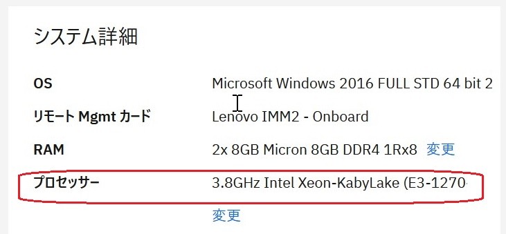 表示されている「プロセッサー」の種類がEoS対象モデルのいずれかに一致する場合、ご利用のサーバは