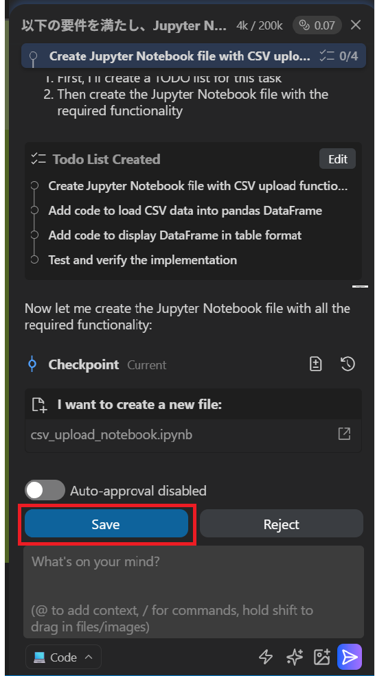 Bobの生成したコード内容を確認し、内容に問題なければ以下画面のSaveボタンを押下し、ファイル作成を許可します。
