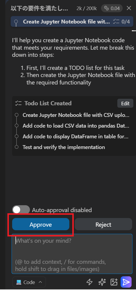 上記画面の赤枠内にプロンプトを入力し実行すると、以下の画面のように実行過程の表示とTodoリストを作成してくれました。