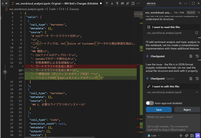 - IBM Bobは、形態素解析やワードクラウドの作成・表示レベルであれば、簡単なプロンプト1回でコードを生成できる