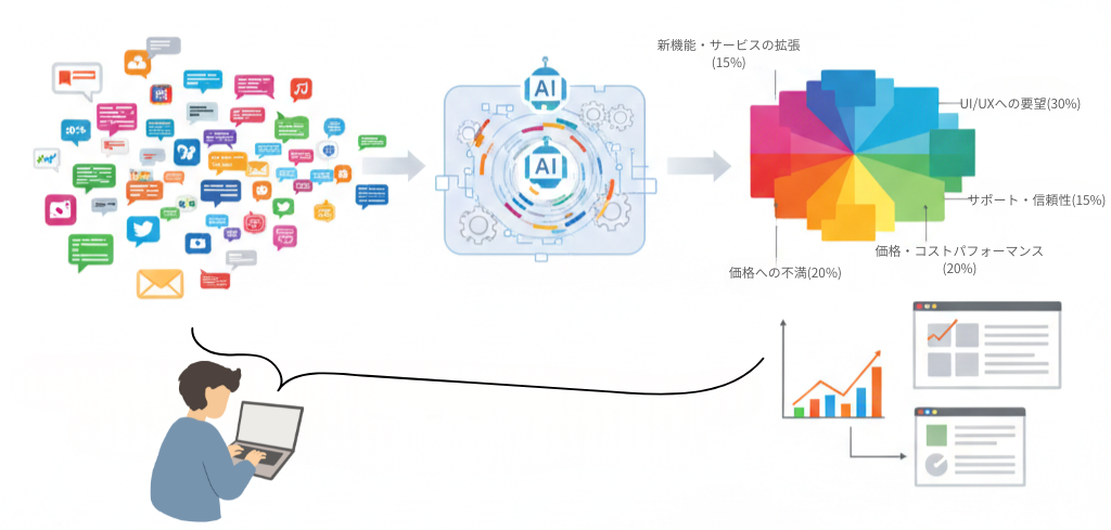アンケートの自由回答、SNSのUGC(※1)や商談ログ。こうした“非構造化データ”の分析は、これまでは多大な工数をかけるか、外部委託するしかありませんでした。