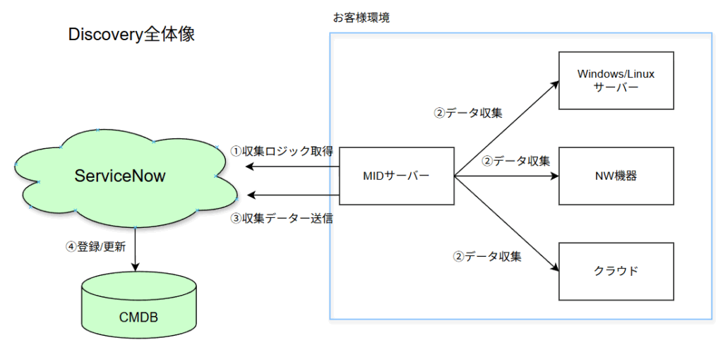 ServiceNow Discoveryは、中継サーバー(以後、MIDサーバー)を経由してデバイスの情報を収集します。