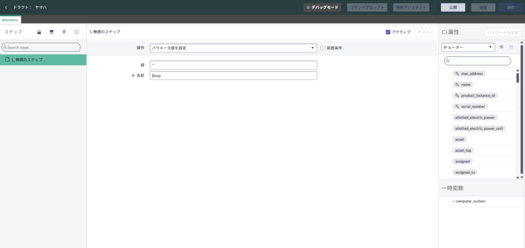 収集した機種名をインスタンスのIPルーター(cmdb_ci_ip_router)テーブルへ代入するステップを追加します。