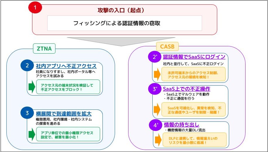 ここからは、よくある攻撃の流れを1本取り上げて、「この場面ではZTNAが効く」「この場面ではCASBが効く」という形で整理してみます。