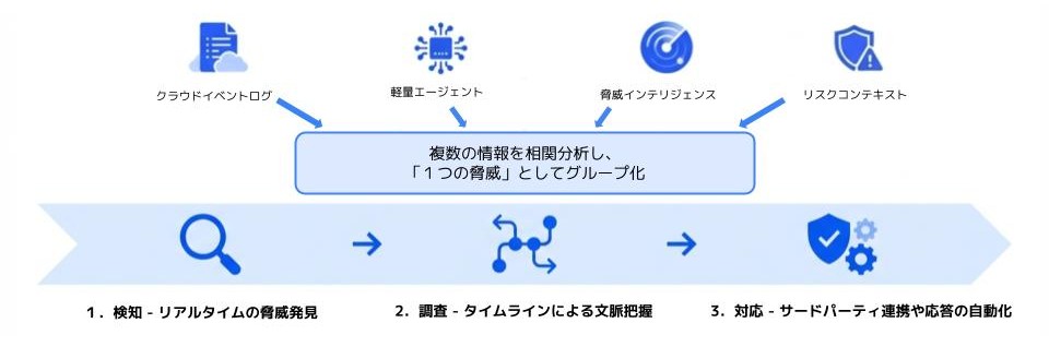 クラウドのイベントログに加えて、必要に応じて軽量なエージェントも活用しながら、リアルタイムに脅威の検出が可能です。