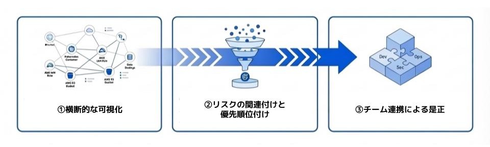 こうした背景から、クラウド全体を横断して可視化し、設定・権限・脆弱性・資産・CI/CDなどの情報を関連付けてリスク評価・優先順位付けまで行うアプローチが求められています。