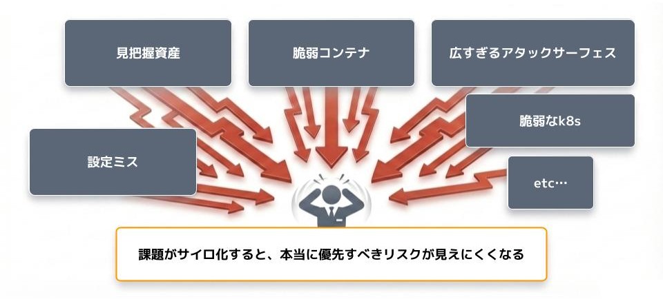 - アラートが多すぎる:サイロ化した個別ツール運用からの大量のアラートが発生します。そのため攻撃経路やビジネスリスクへの影響を伴う「本当のリスク」の判断が困難になっています。