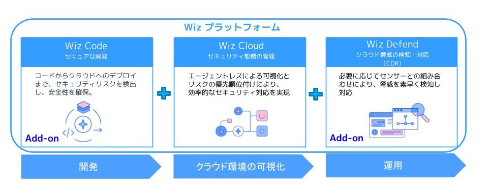 中核となるのがWiz Cloudで、Wiz Security Graphによる関係性の可視化と、エージェントレスでの迅速な把握により、分散しがちなクラウドリスクを横断して捉えやすくなります。