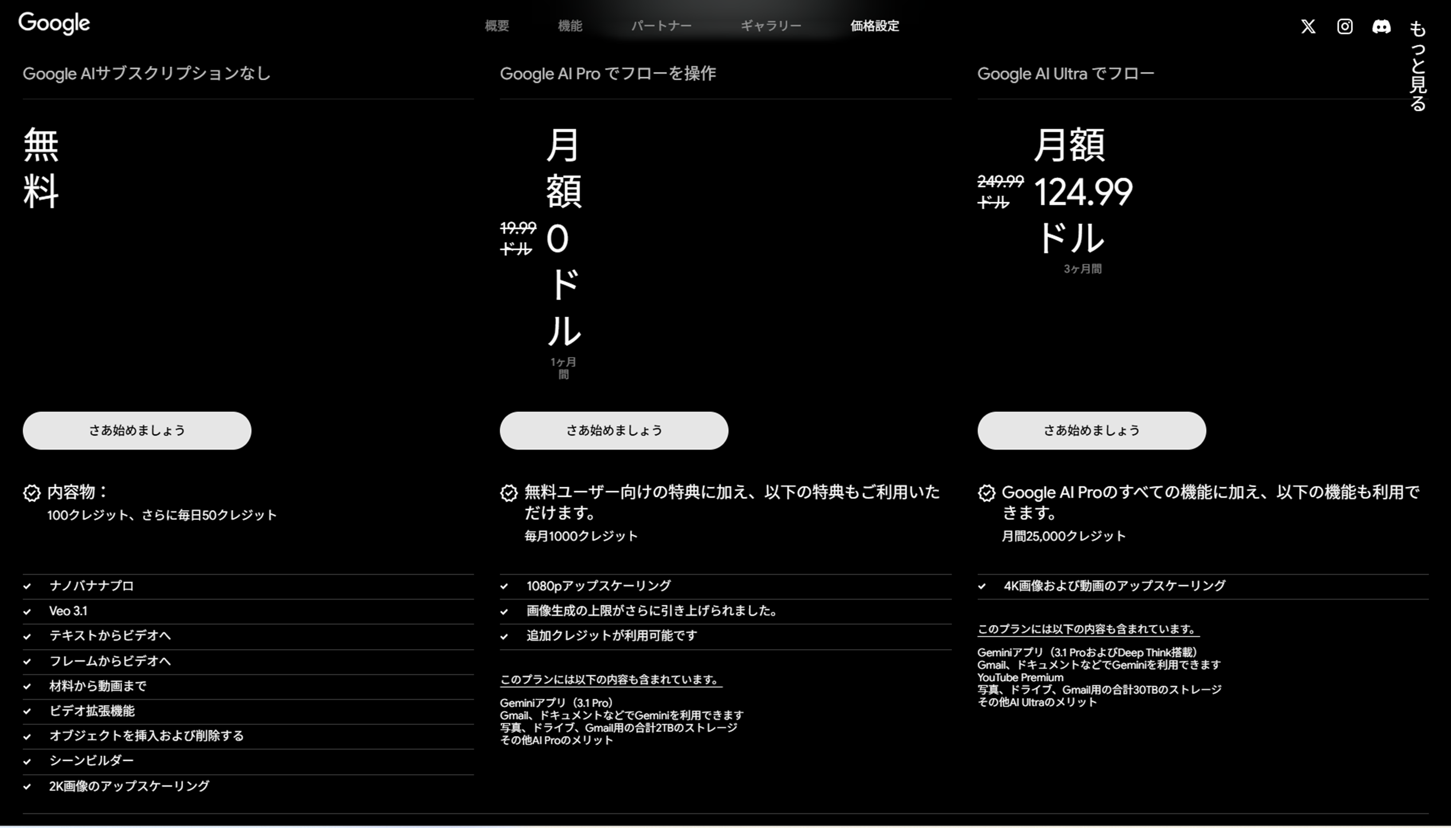Flowの料金プランには、「無料枠」と有料プランの「Google AI Pro」と「Google AI Ultra」の2種類があります。