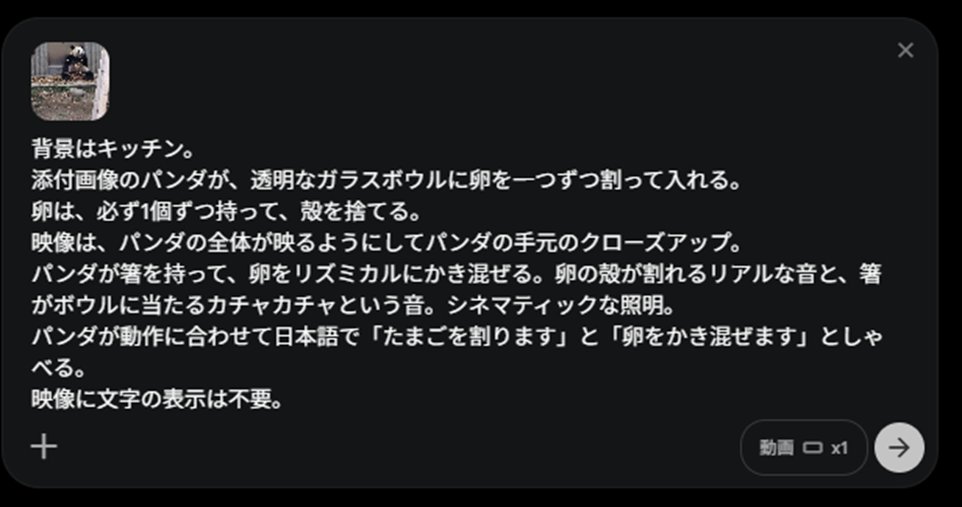 出来上がった動画を見て頂くと、画像のパンダが器用に卵を割って、卵を混ぜるシーンが違和感のない効果音と共に生成されていることが分かると思います。