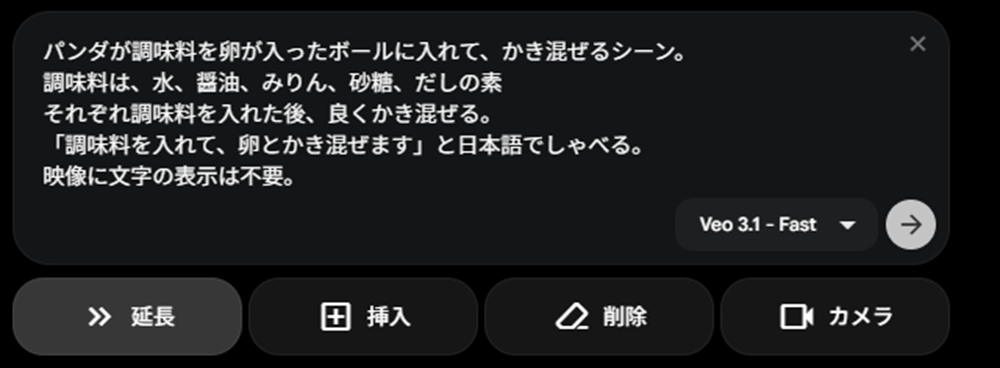 背景のキッチンや主役のパンダは、シーン①が引き継がれているため、プロンプトには、調味料を入れて混ぜるシーンの説明と日本語で何をしゃべるかを記載します。