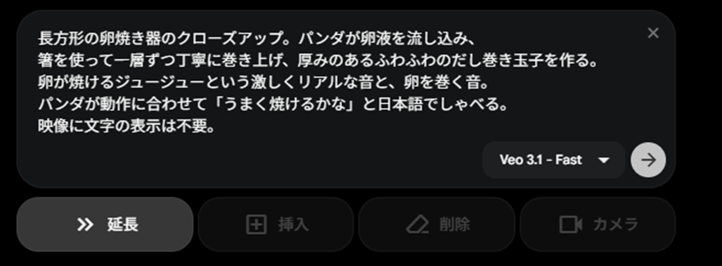 ②で生成した動画の続きとして、だし巻き玉子を焼くシーンを②の動画に追加して生成していきます。