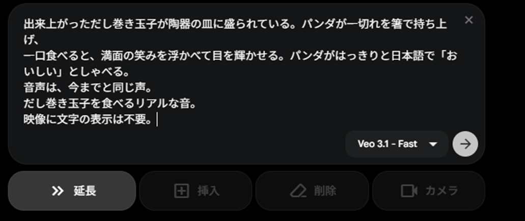 ③で生成した動画の続きとして、だし巻き玉子を食べるシーンを③の動画に追加して生成していきます。