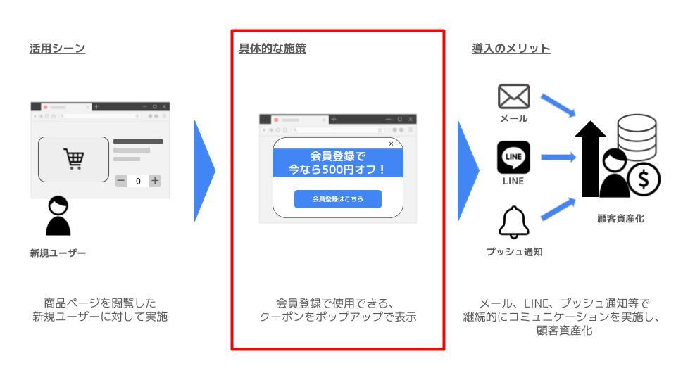 新規ユーザーをファンへと育てる鍵は、適切なタイミングでの会員登録促進にあります。初回購入のハードルを下げつつ、MAツールを介した中長期的な関係性を築くための王道ステップです。