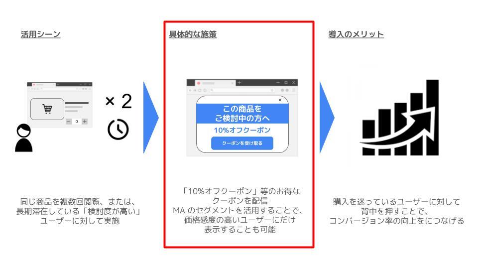 購入を迷っている検討層に対し、最適なタイミングで限定オファーを提示することで、離脱を防ぎコンバージョン率を劇的に向上させます。サイト内行動から『買い時』を逃さない、精度の高いアプローチ手法です。