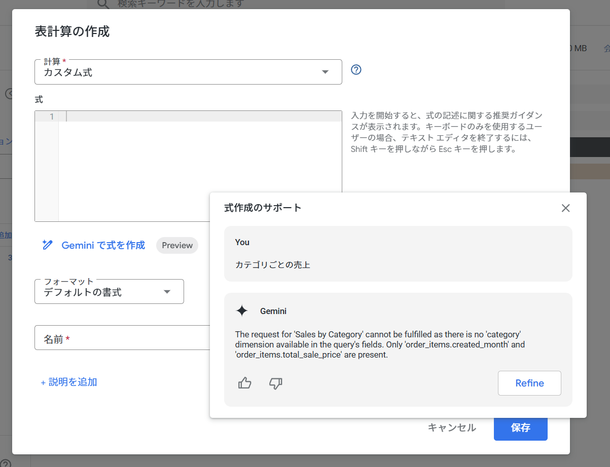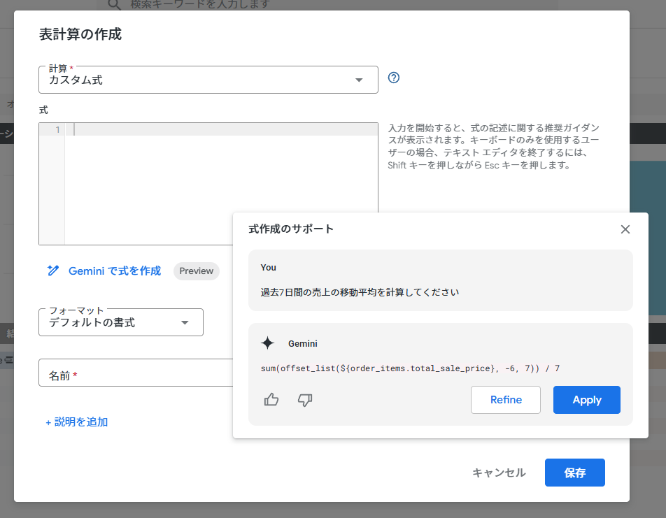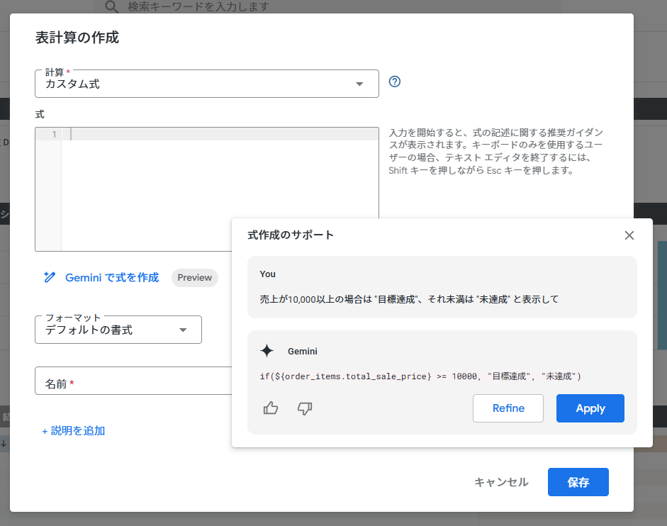 送信ボタンを押すと、Geminiが意図を汲み取り、対象となるフィールド(この場合は売上のメジャー)を自動で判断して、正確なLooker関数の数式を提案してくれます。