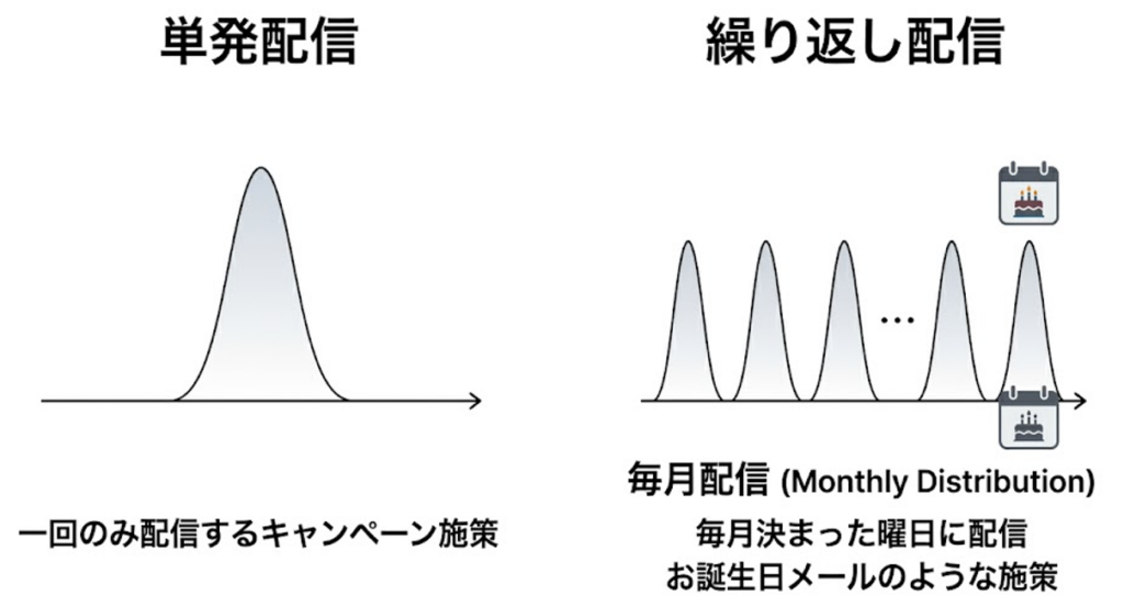 単発配信キャンペーンでは、メールマガジンや都度内容が変わる施策を配信するキャンペーンとして利用されます。