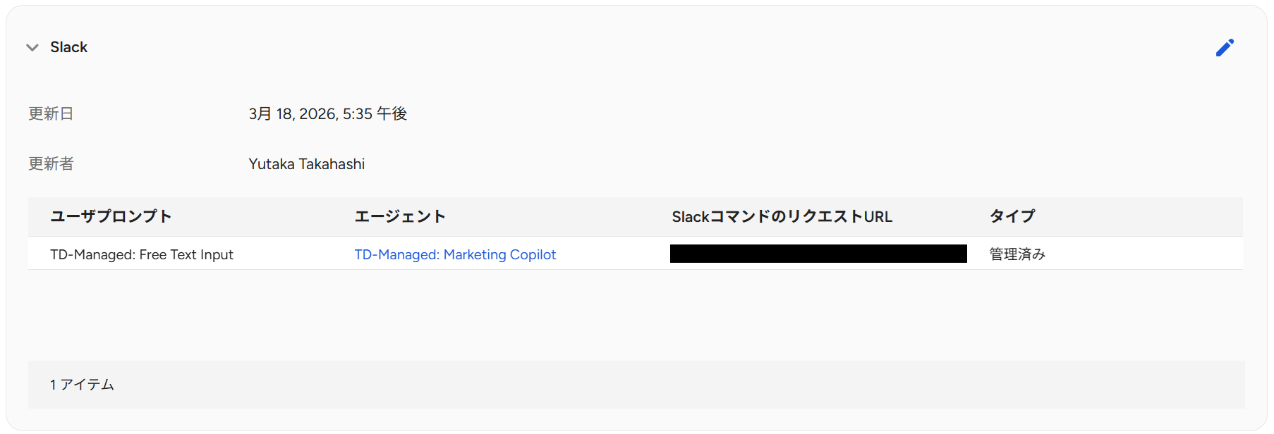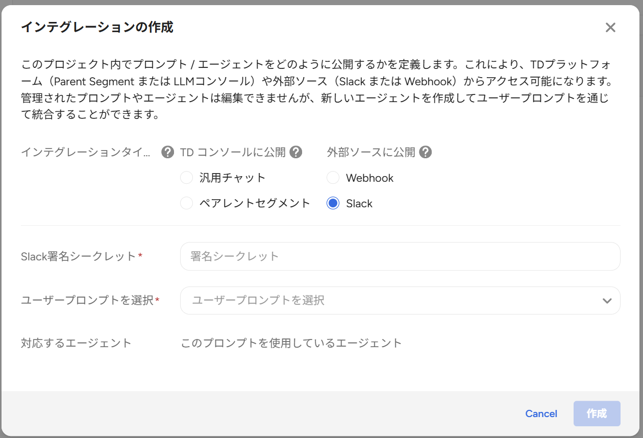 | Command | /ask-td-agent | Slackで呼び出すためのコマンド名です。 |