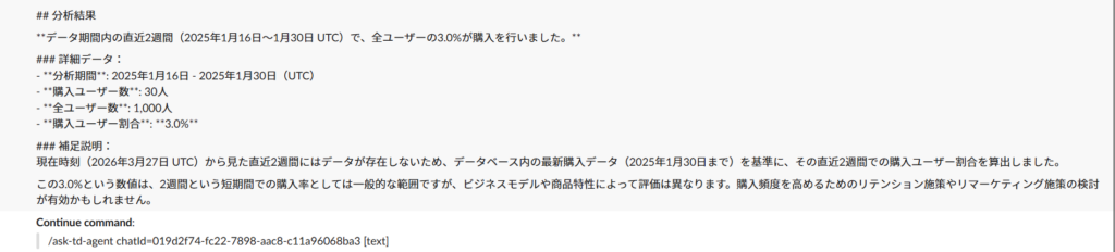 /ask-td-agent 直近2週間で購入したユーザーの割合を教えて